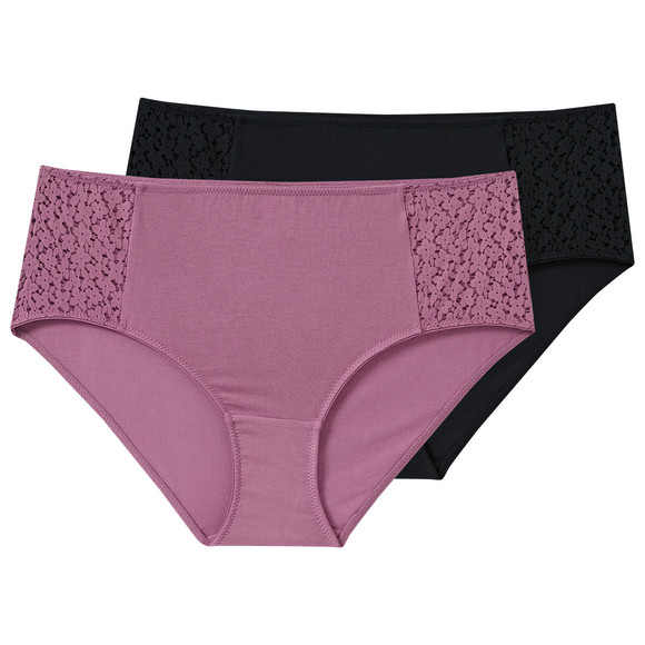 Zwei Pantys aus weichem Modal-Mix in Blau und Grau. Je mit floraler Spitze an den Seiten und elastischen Ausschnitten.