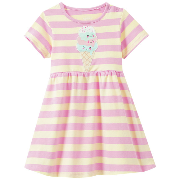 Gestreiftes Kleid in Hellgelb und Zartrosa. Vorne mit großer Eis-Applikation. Paspelierter Rundhalsausschnitt, linksseitige Schulterknöpfung und ausgestellter Schnitt.