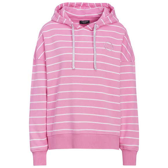 Hoodie in Rosa mit weißen Streifen allover. Mit verstärkten Ösen am Tunnelzug der gefütterten Kapuze. Mit kleiner Stickerei auf der Brust und formstabilen Bündchen für hohen Tragekomfort. Am Saum seitlich geschlitzt. Innenseite kuschelig weich.
