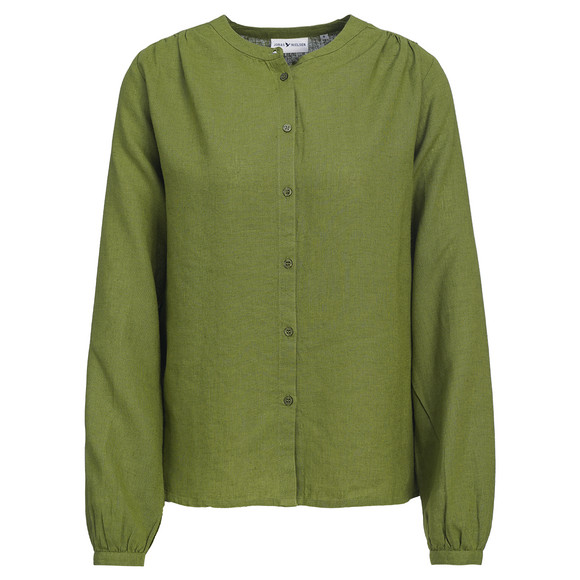 Langärmelige Bluse in Dunkelgrün in angenehmer Leinen-Viskose-Qualität. Schmaler Rundhalsausschnitt und durchgehende Knopfleiste vorne. Schmale, einfach geknöpfte Ärmelbündchen. Dezente Raffung an den Schultern, Ärmeln und im Rücken. Saum leicht gerundet.
