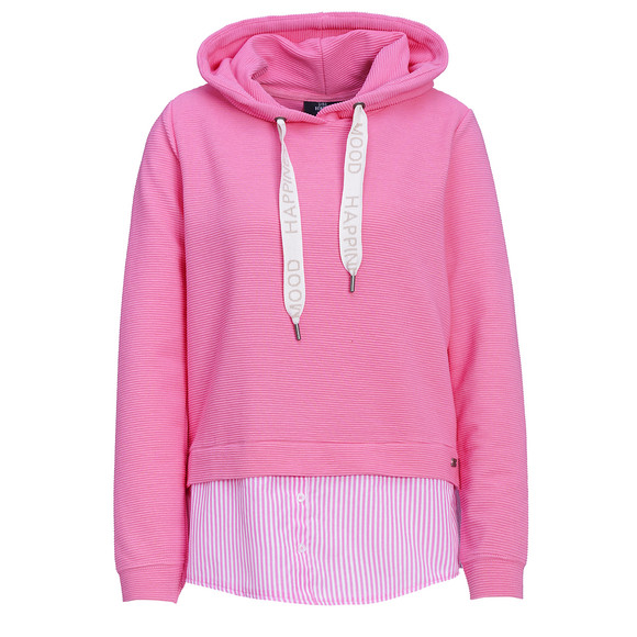 Pinkes Sweatshirt mit Querrippen. Doppellagige Kapuze mit Tunnelzug und Zugband mit "Happiness is a mood" Schriftzug. Eingenähter Bluseneinsatz mit Streifen-Muster in Weiß und Pink am Saum mit imitierter Knopfleiste und Schlitzen an den Seiten.
