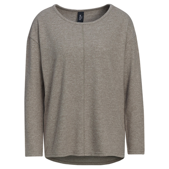 Blau meliertes Feinstrickshirt mit paspeliertem Rundhalsausschnitt, leicht überschnittenen Ärmeln und Ziernaht auf der Front. Saum hinten länger geschnitten sowie abgerundet.