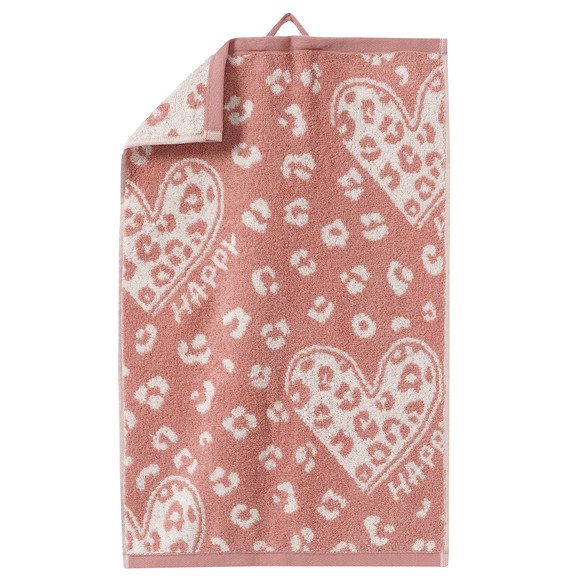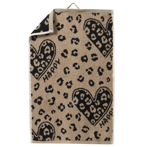 Beige-schwarzes Gästetuch aus Baumwolle und in hochwertiger sowie hautsympathischer Frottee-Qualität. Mit Herz-Allover auf beiden Seiten. Paspelierte Abschlüsse und praktische Schlaufe zum Aufhängen.