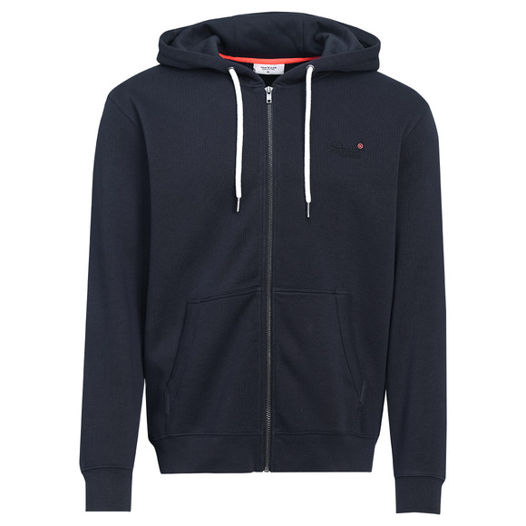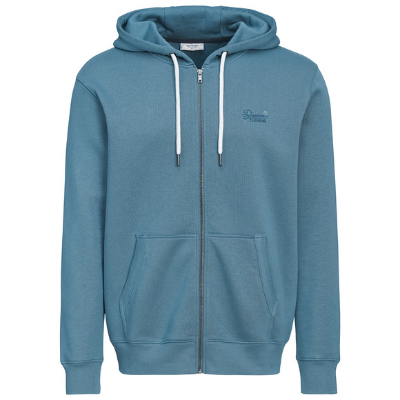 Dunkelblaue Sweatjacke mit kleiner Stickerei auf der Brust. Doppellagige Kapuze mit Tunnelzug und Kordel. Mit Reißverschluss und zwei Einschubtaschen vorne. Formstabile Rippenbündchen an den Armausschnitten und am Saum. Innen kuschelig weich angeraut.