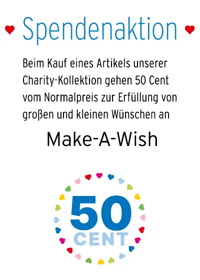 Für jeden Artikel, den Sie aus dieser Charity-Kollektion kaufen, spenden wir 50 Cent, um lebensverändernde Wünsche für Kinder und Jugendliche zu unterstützen. Gemeinsam können wir helfen, Wünsche wahr werden zu lassen.
