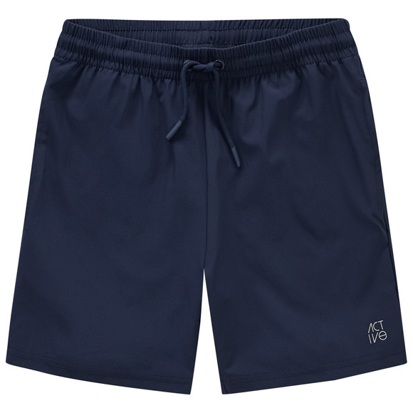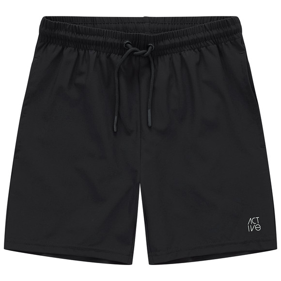 Leichte schwarze Shorts mit Tunnelzug. Mit elastischem Bund und zwei Eingrifftaschen. Gummierter Text-Print auf dem linken Bein. Schnell trocknend und atmungsaktiv.