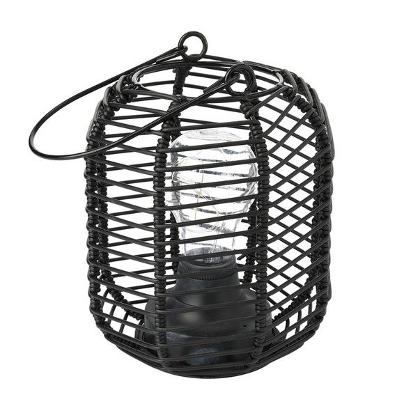 Schwarze LED-Lampe in Rattan-Optik aus Kunststoff und Rahmen aus Metall. Ein- und Ausschaltknopf neben dem Batteriefach an der Unterseite. Nur für den Innenbereich geeignet. 3 x 1,5V AA Batterien nicht enthalten.