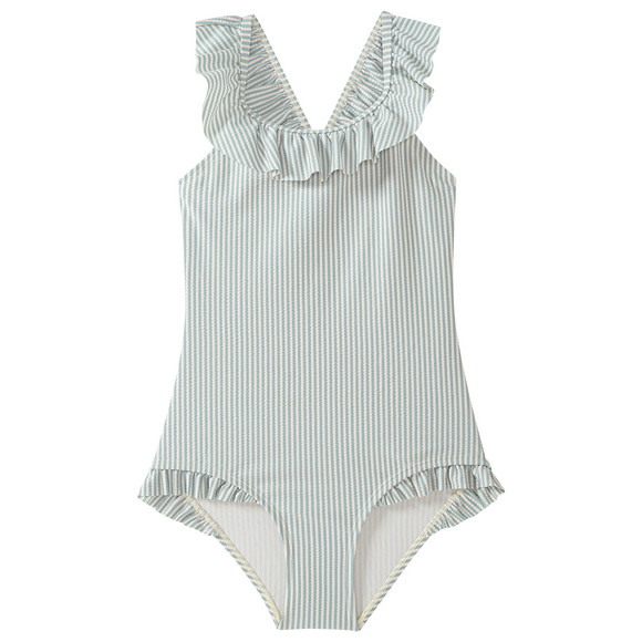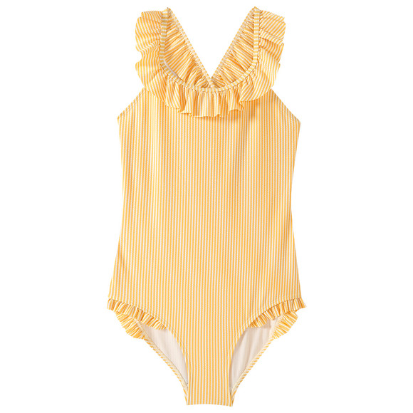 Gelb-weiß gestreifter Badeanzug mit Seersucker-Struktur. Im Rücken gekreuzte Träger für einen guten Sitz. Mit Rüschenbesatz an Ausschnitt, Trägern und seitlich am Bein. Komplett gefüttert.