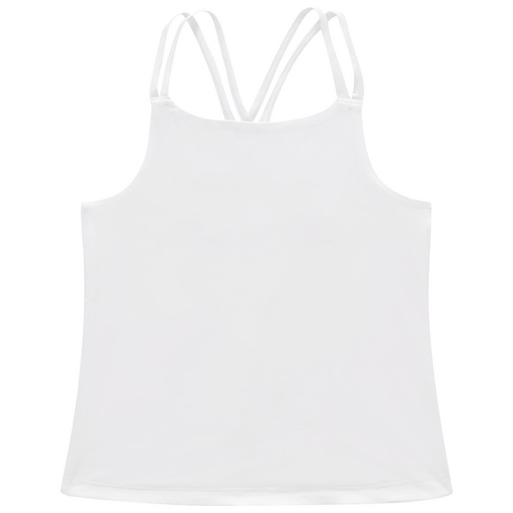 Weißes Top aus leichtem Funktionsmaterial. Mit rundem Ausschnitt und doppelten, im Rücken gekreuzten Spaghettiträgern. Kleiner Text-Print hinten. Doppellagig und figurnah geschnitten.