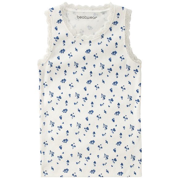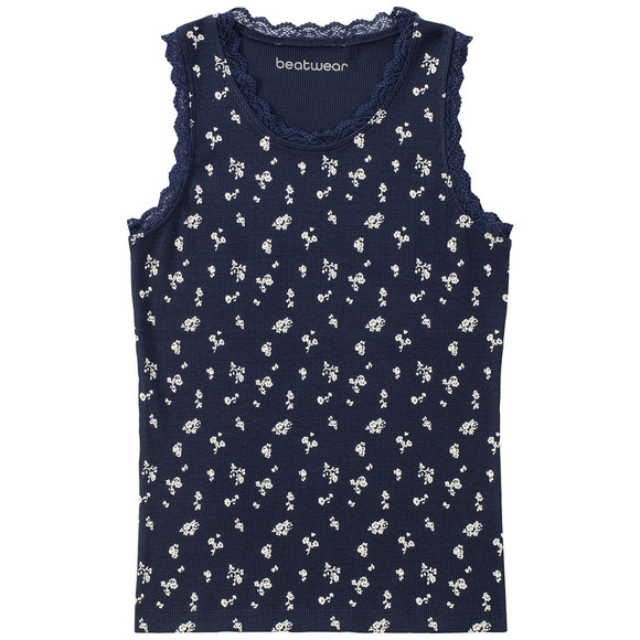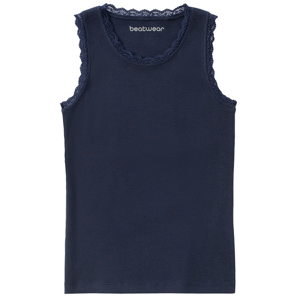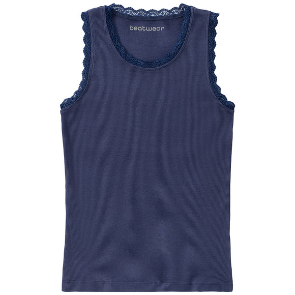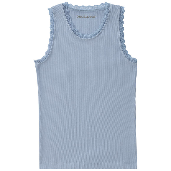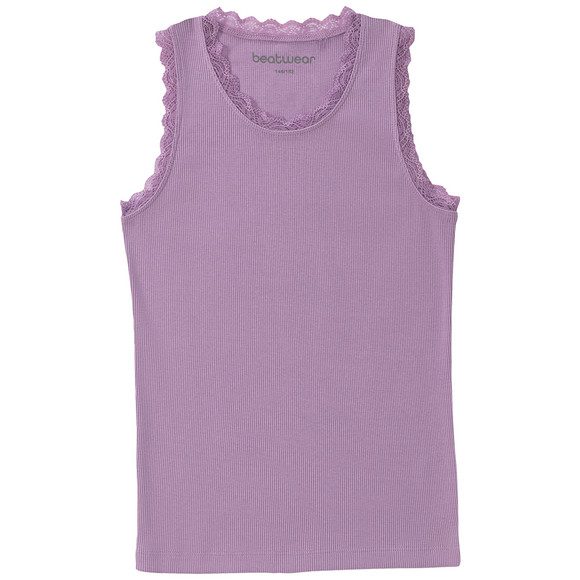 Fein geripptes Top in unifarben Helllila. Mit filigraner Spitze an den Armausschnitten und dem Rundhalsausschnitt.