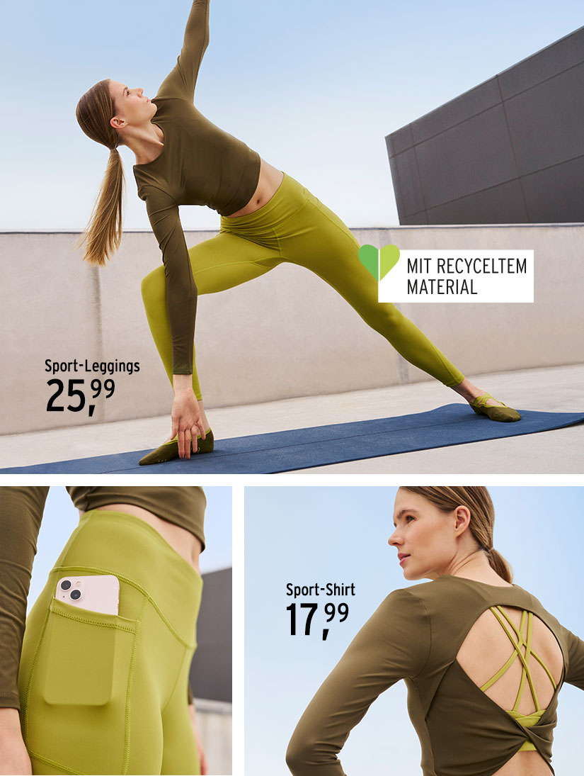 Mehr Spaß beim Training mit einem neuen Sport-Outfit: T-Shirts, Tops, Leggings und Sportjacken in aktuellen Trendfarben. Highlights sind die Reflektor-Prints, die im Dunkeln leuchten, und das gemütliche Modal-Set – ideal für Yoga und mehr!